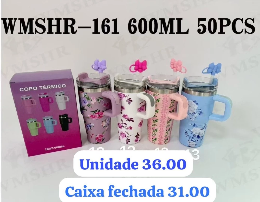 Copo térmico 600ml WMSHR-161 com alça e canudo, parede dupla e tampa vedada. Mantém quente ou gelado por horas. Cores variadas.