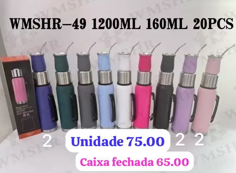 Garrafa térmica 1200ml WMSHR-49 com copo 160ml e canudo de inox. Alça lateral e corpo em aço inox para melhor conservação.