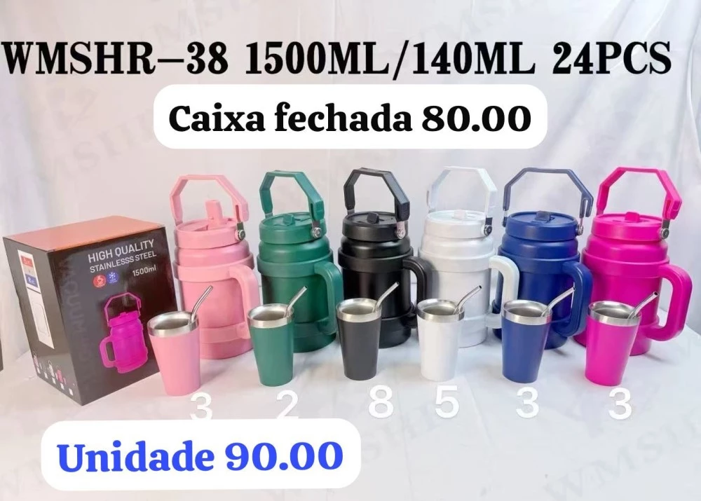 Garrafa térmica 1500ml WMSHR-38 com copo 140ml em inox. Design robusto, ótima vedação e praticidade.
