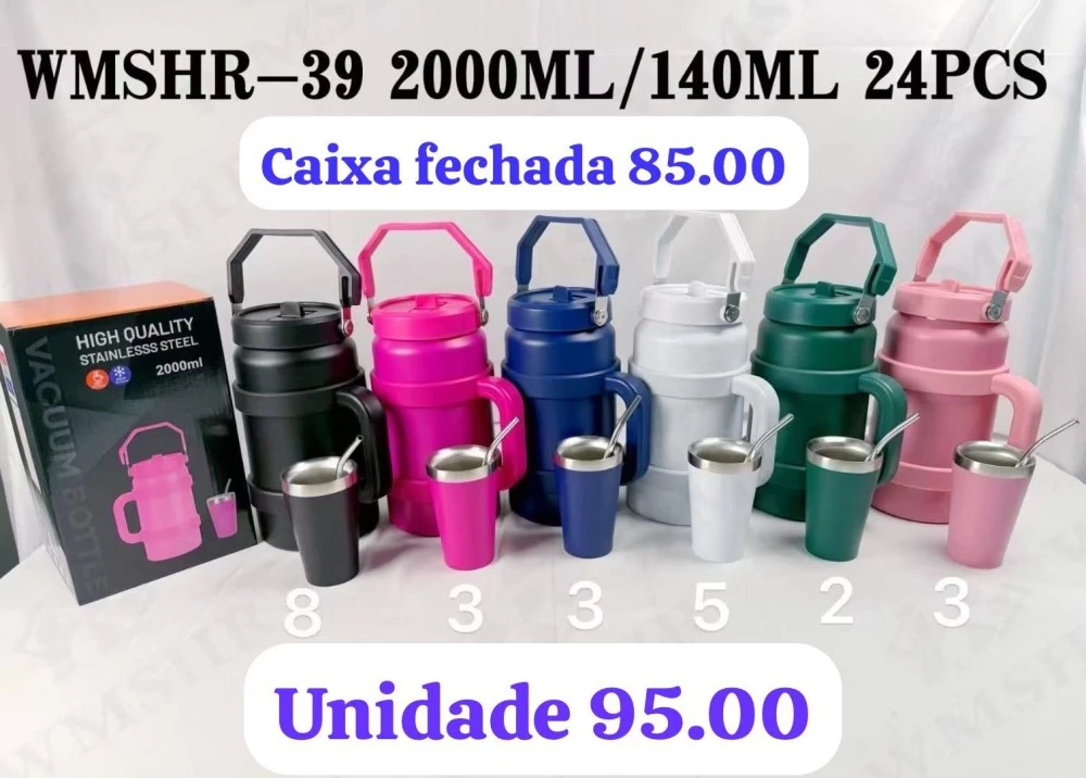 Garrafa térmica 2000ml WMSHR-39 com copo 140ml em inox. Grande capacidade, perfeita para quem passa o dia fora.