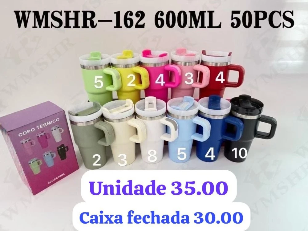 Copo térmico 600ml WMSHR-162 com alça, tampa deslizante e parede dupla. Estilo moderno e várias cores.