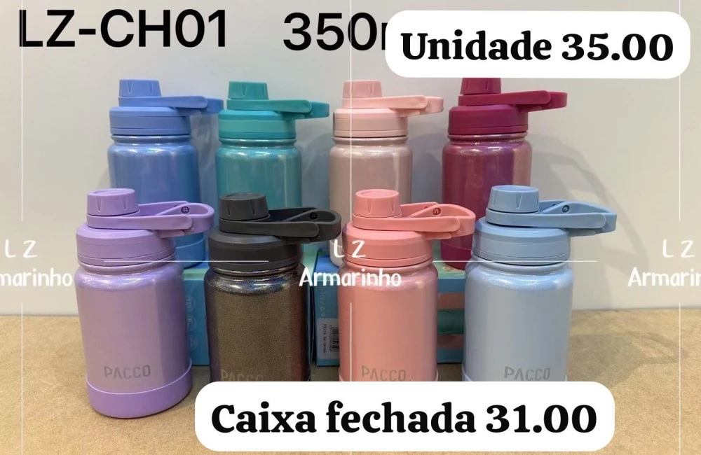 Garrafa térmica 350ml LZ-CH01 compacta e prática para o dia a dia. Acabamento perolado em várias cores.