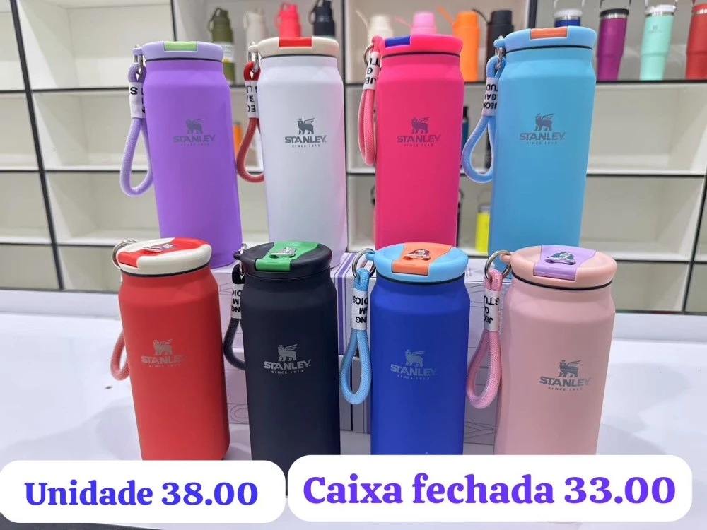 Garrafa térmica Stanley 600ml com alça de corda lateral. Design moderno, prática e disponível em diversas cores.