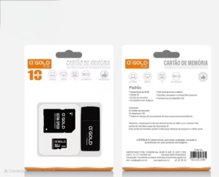 Cartão de memória α’GOLD 32GB com adaptador USB. Alta velocidade para gravação de vídeos, fotos e arquivos. Compatível com diversos aparelhos.