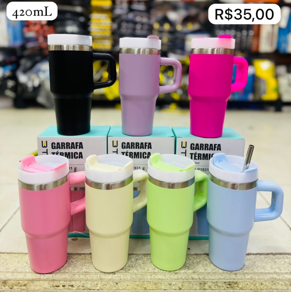Garrafa térmica de 420ml com alça lateral, disponível em várias cores, ideal para bebidas quentes e frias.