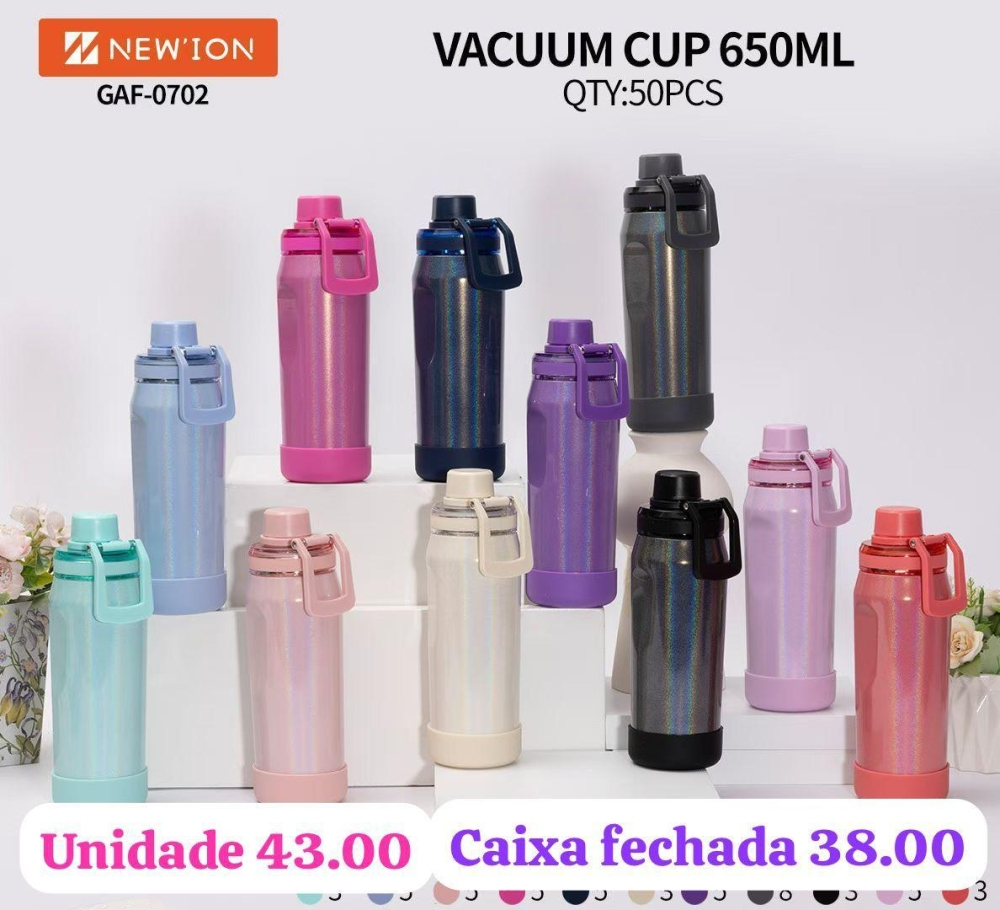 Garrafa térmica New'ion modelo GAF-0702, capacidade de 650ml, disponível em várias cores.