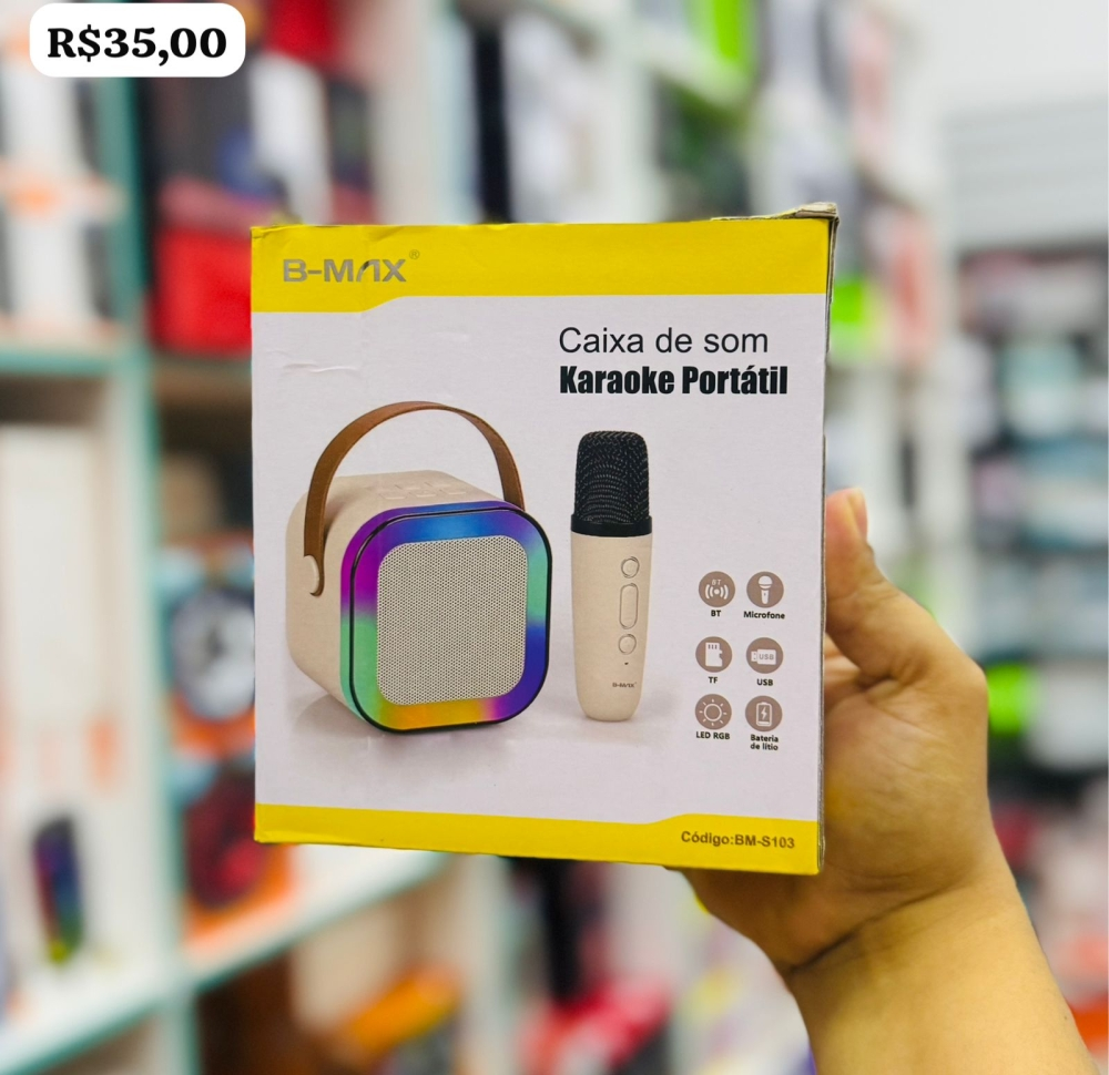 Mini caixa de som com microfone, conexão Bluetooth, USB e luzes LED RGB. Ideal para uso em casa ou pequenos eventos.