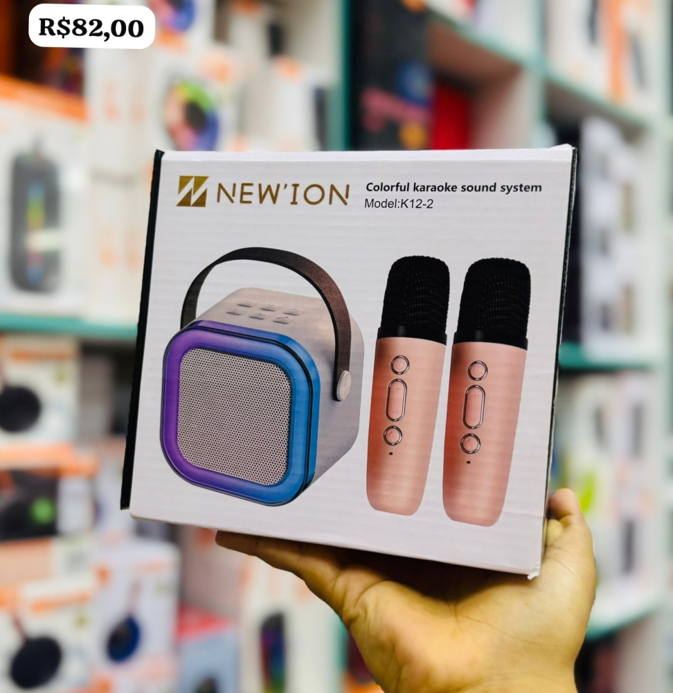 Sistema de karaokê com 2 microfones e caixa potente com LED colorido. Perfeito para cantar com amigos.