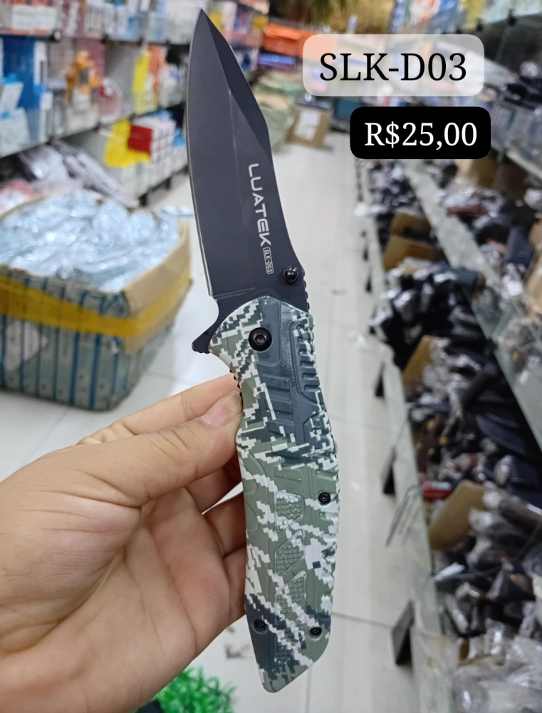Canivete Luatek SLK-D03 com lâmina preta e cabo camuflado. Design tático ideal para acampamentos e atividades ao ar livre.